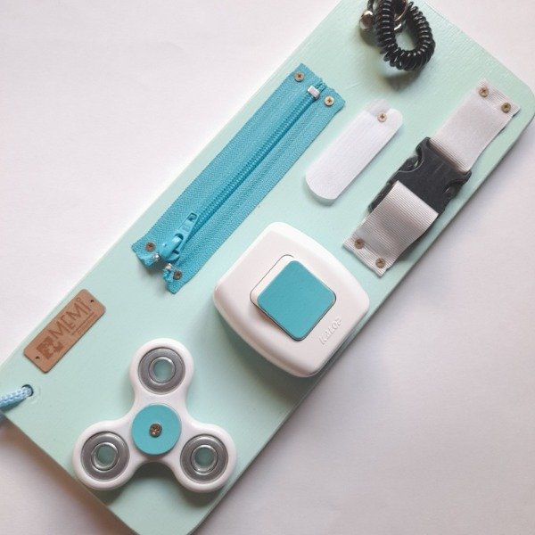 Tablero Sensorial Portable con Spinner, Cierre, Velcro y Broche. Color: Verde